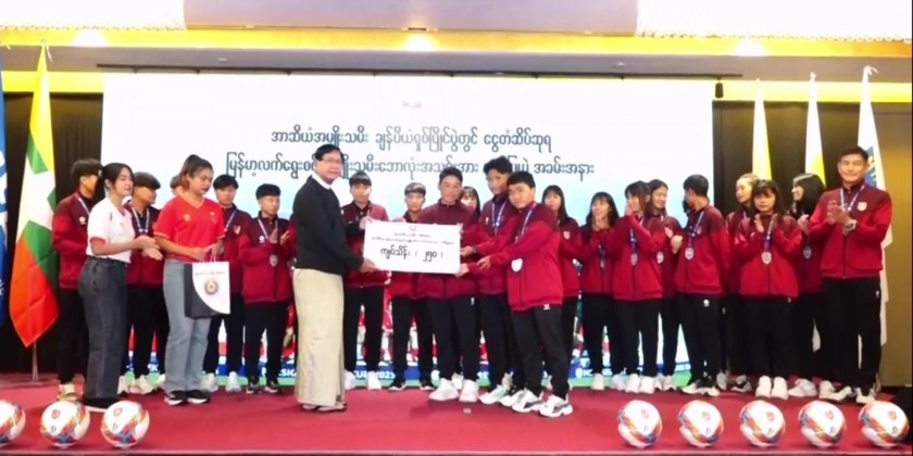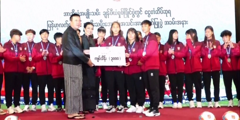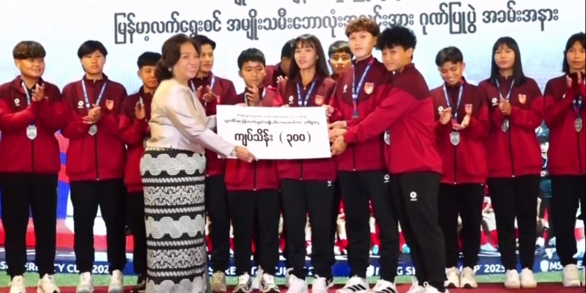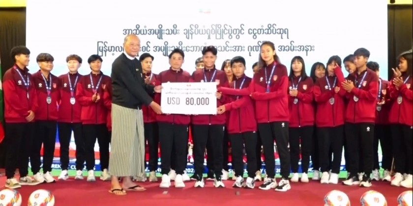 Additional cash rewards totaling over 863 million kyats were also presented for the team. Top scorer Win Theingi Tun sent a thank-you message via video, and team captain Khin Marlar Tun expressed gratitude on behalf of the team.