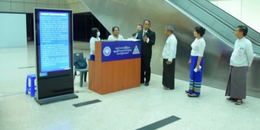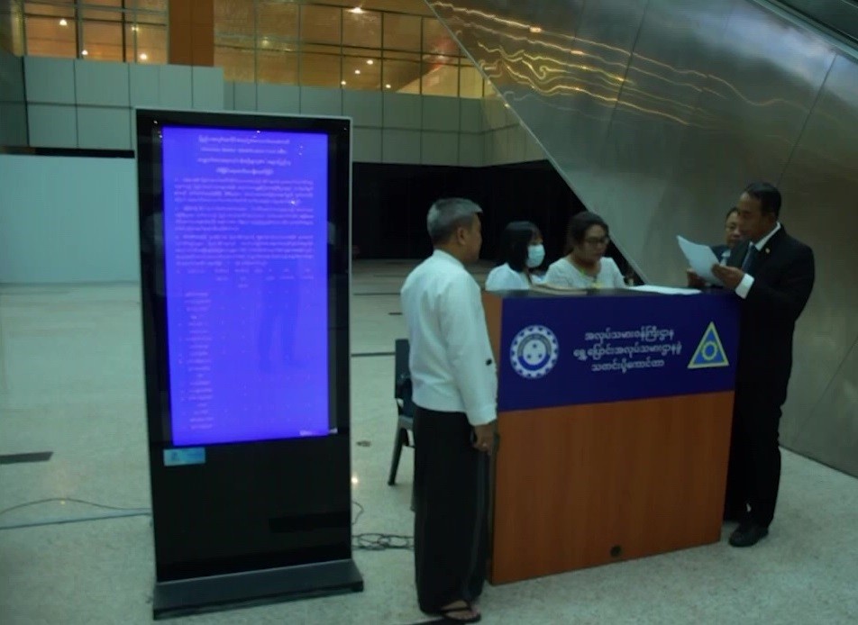 By the time of arrival at Yangon International Airport, the Union Minister inspected the Myanmar workers who bear the Job Passport (PJ) and will depart so that whether they hold the Oversea Workers Identification Card (OWIC) or not for them to acquire officials job in their destination country, to mitigate illegal departing, to entitle the migrant workers’ rights, to enhance protection for them and collect the information at Myanmar Migrant Workers’ Reporting Counter opened at Yangon International Airport and gave necessary instructions.