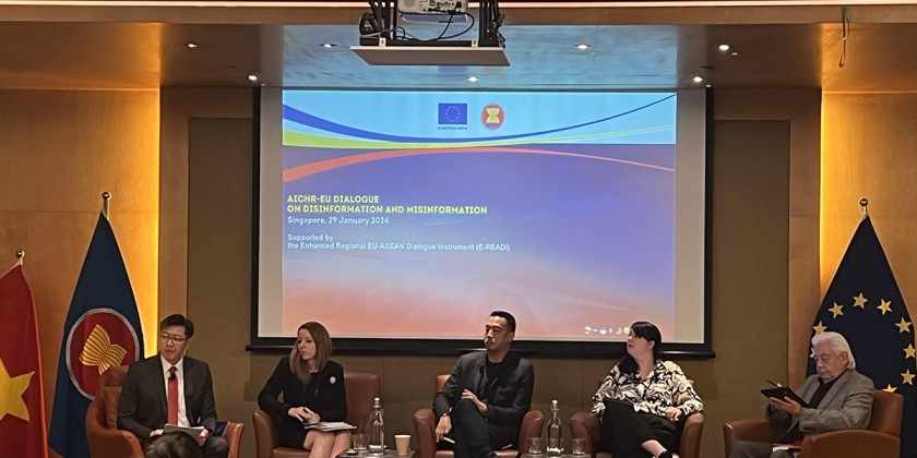A meeting between the ASEAN Intergovernmental Commission on Human Rights and the European Union regarding with fake news and disinformation was held at JEN Singapore Tanglin by Shangri-La in Singapore at 9:30 AM local time on 29th January and was attended by Myanmar Ambassador/ charge d'affaires ad interim U Zaw Zaw Soe, Deputy Permanent Secretary of the Ministry of InformationU Myint Kyaw, Deputy Director-General of the Ministry of Foreign Affairs U Man Hauk Thang and Chairman of the Myanmar Press Council U Ohn Maung (Myinmu Maung Naing Moe).