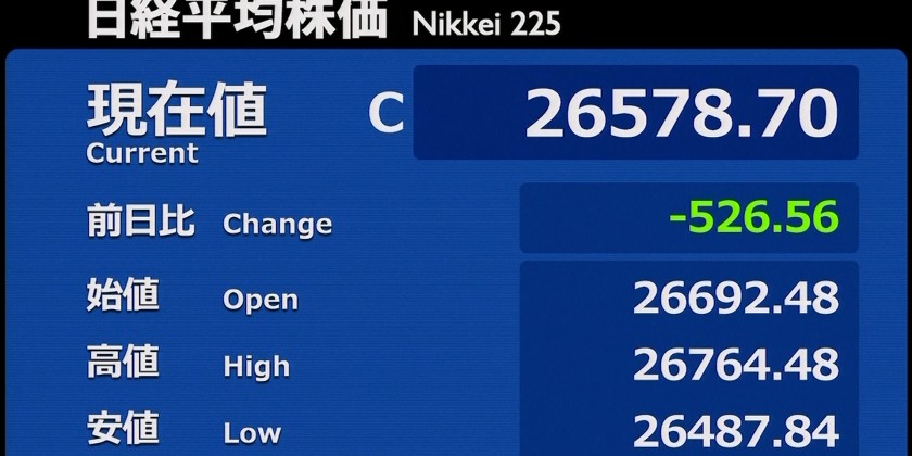 Asian shares declined Monday after U.S. stocks ended last week on a tumble as global markets' expectations for higher interest rates continued to set the tone. Japan's benchmark Nikkei 225 lost 1.9% in morning trading to 26,583.70.