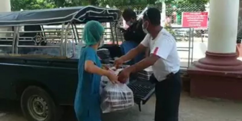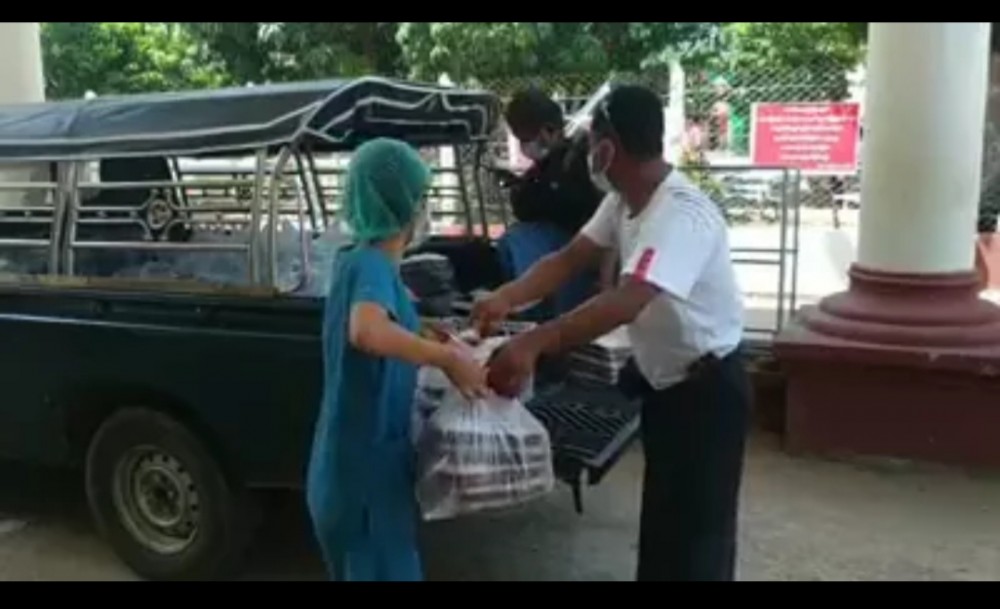 According to the local society organizations and volunteer groups, food boxes, water bottles, and food items were donated for the COVID-19 patients, healthcare workers and medical staffs from Meikhtila General Hospital and quarantine center at the Meikhtila University.