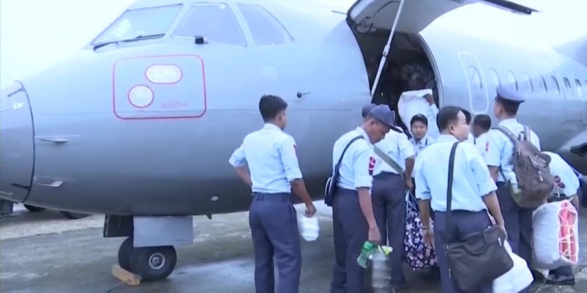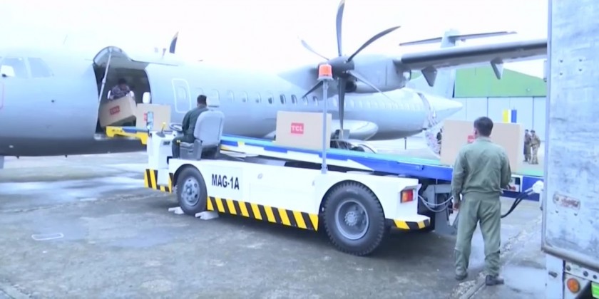 Tatmadaw (Air) is delivering relief aid and food stuff donated by families of Tatmadaw (Army, Navy and Air) and well-wishers and relief items provided by the National Disaster Management Committee by Tatmadaw aircrafts and helicopters to the locals affected by natural disasters in Rakhine State.