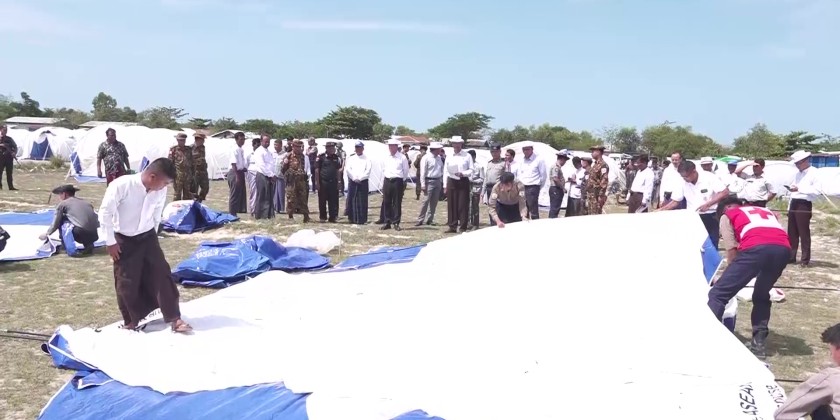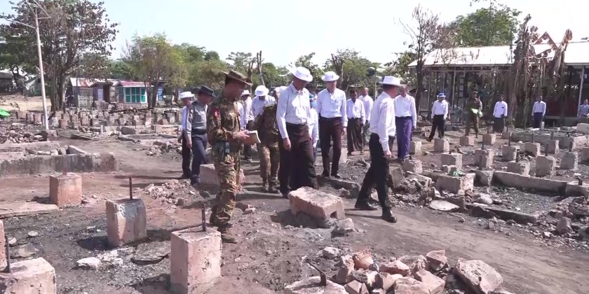 At the Say Thamar Gyi IDP camp, they reviewed the clean-up completion status after the fire outbreak, and coordinated the needs. They also observed the joint healthcare efforts of local Tatmadaw and State Public Health Department medical teams for fire victims.