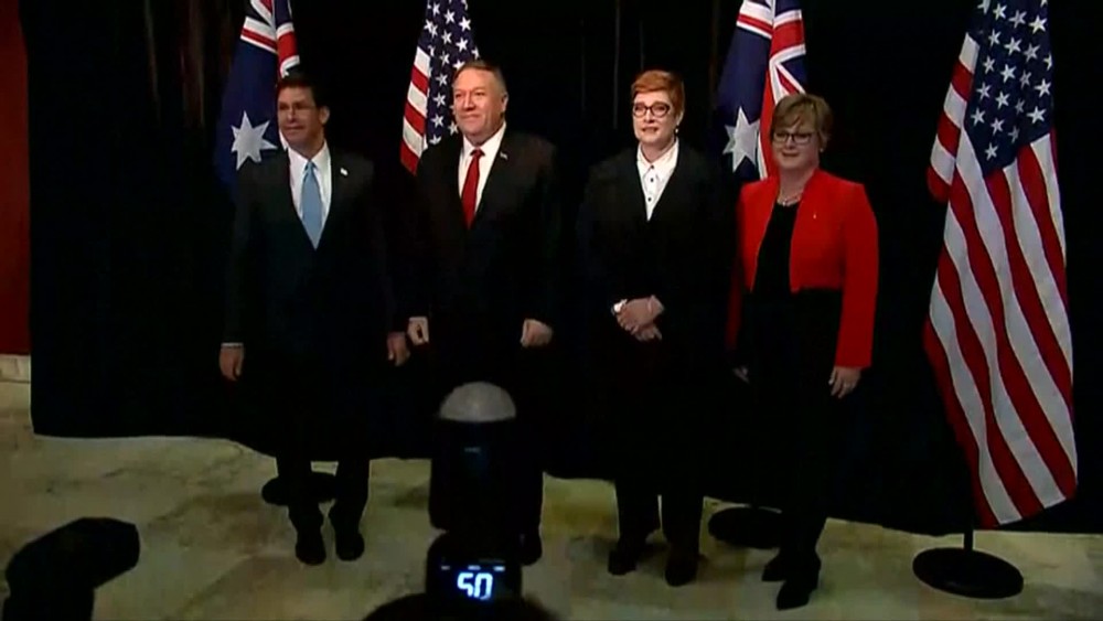 Australian Foreign Minister Marise Payne and Defence Minister Linda Reynolds met their American counterparts, posing for a family photo as the group prepared to discuss global and regional issues. The meeting comes amid heightened Western concern about Chinese influence in the Pacific.