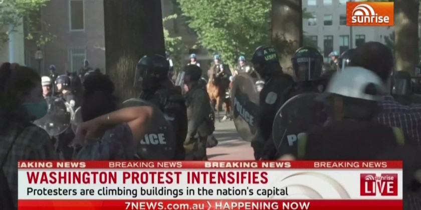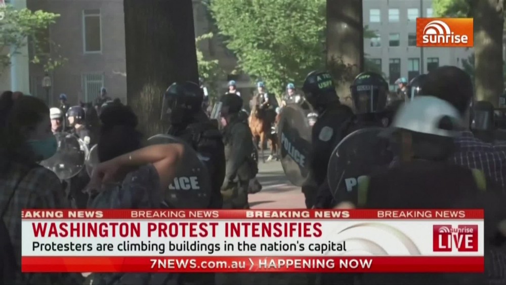 An Australian camera man was struck by police in Washington, D.C. on Monday. Seven Network journalist Amelia Brace was speaking live on air when police rushed protesters where Brace and cameraman Tim Myers were stationed. As the crowd began running back, footage shows a police officer turning towards Myer and lunging a fist into the camera lens.