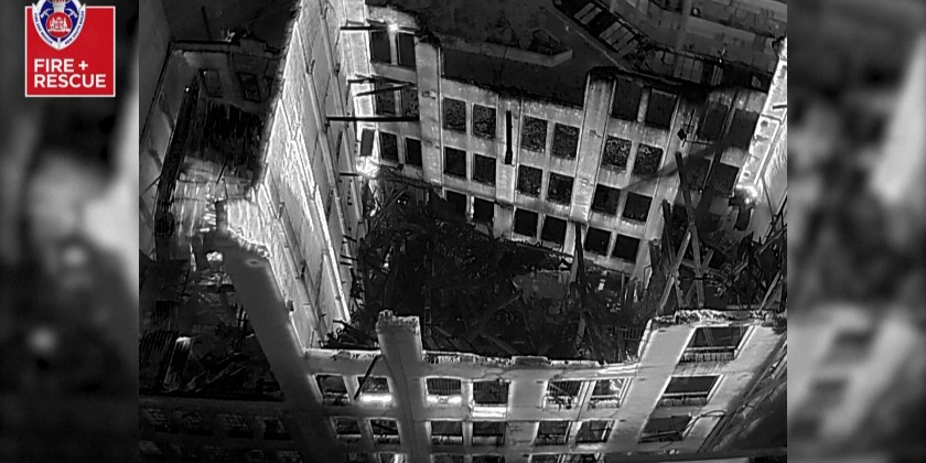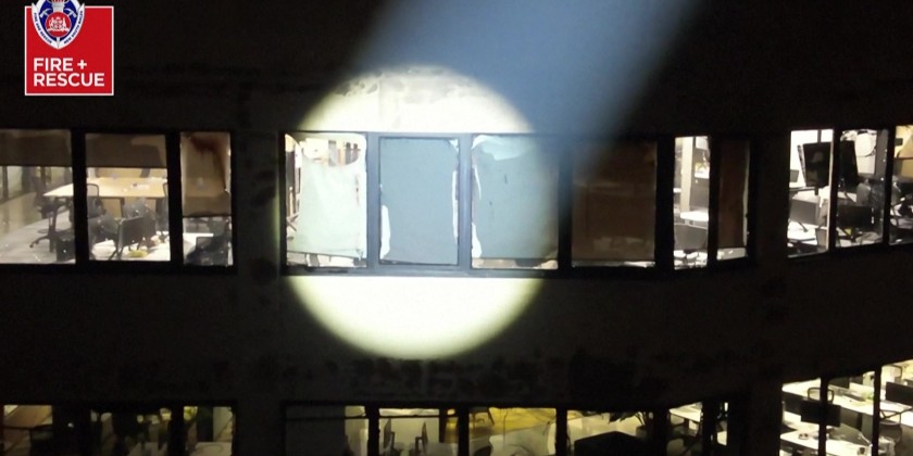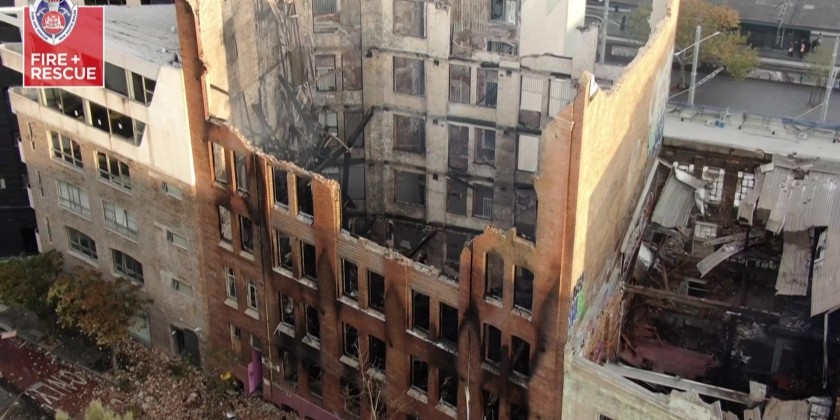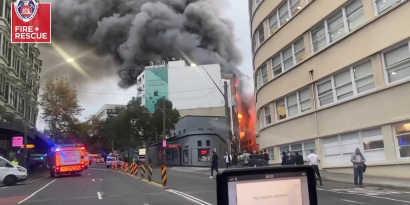 More than 130 firefighters battled towering flames and thick smoke Thursday as a huge blaze consumed an unoccupied seven-storey building in central Sydney. The flames appeared to be dying down as firefighters poured in water from multiple hoses two hours after the fire took hold in the vacant building near the Central Station railway hub.
