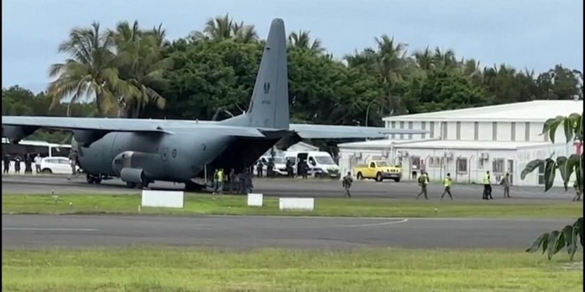 The C-130 Hercules aircraft is the first rescue flight since looting, arson and deadly gunfire enveloped the French Pacific territory eight days ago.
