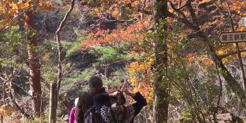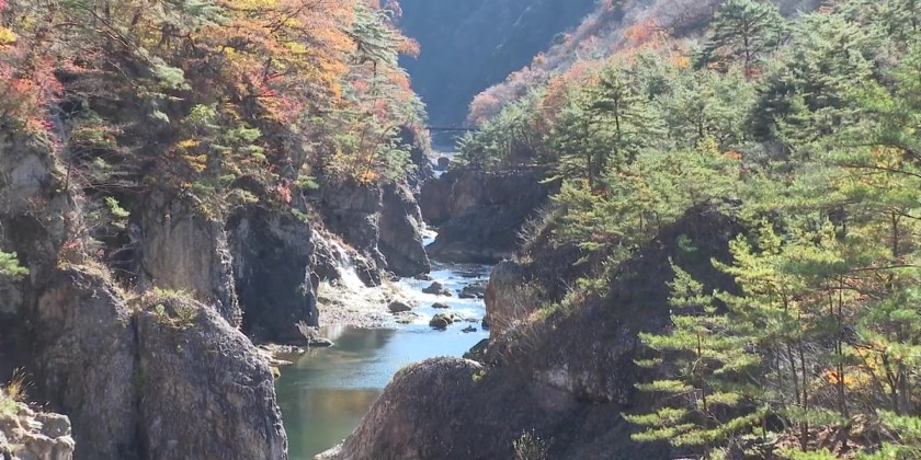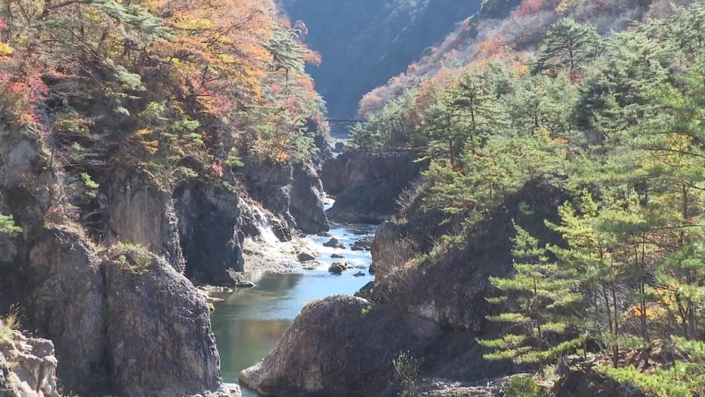 At this time of year, maple trees and azaleas along the gorge take on hues of red and yellow, allowing visitors to enjoy both the magnificent terrain and autumn foliage. A tourist from Tokyo said the coloring of the leaves was more beautiful than she had expected. She said this is a landscape she cannot enjoy in Tokyo and it has a healing effect on her.