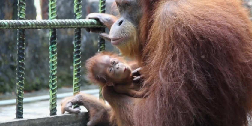A baby orangutan born earlier this month at a conservation center on Indonesia's Sumatra Island. Ade was born to 15-year-old mother Susi, who has been at the facility since she was about three years old. The orangutan mother was handed over the center by villagers.