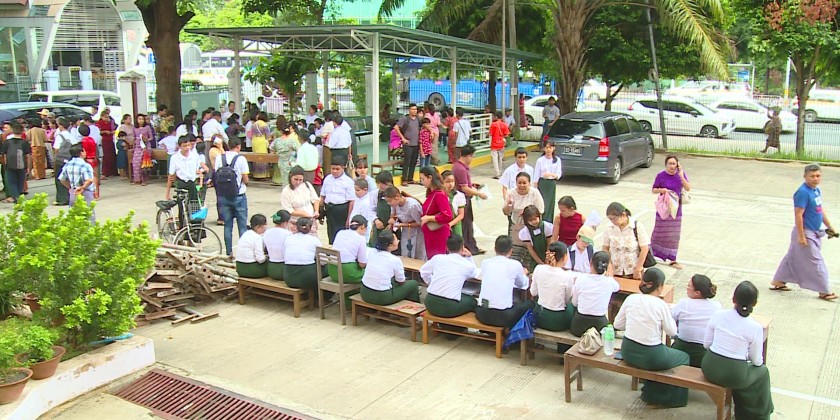 Myint Maung Kyaw, Parent said "I am here to enroll my daughter who is going to attend Kindergarten. We have to queue to get a token to meet with the Principal. There are five principles set for accepting KG students. There is no fee collected for school enrollment."