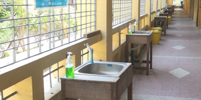 The posters and vinyl that instructed the Covid-19 guidelines were hanged every places of the school compound. The students do not share the items and use only private ones. The students are allowed to have lunch at their respective tables and not allowed to go to toilet hand in hand. Two trash bins and two hand wash basins were put in each room. There are 250 hand washing basins at the Practicing High School (Yangon) formerly known as TTC school.