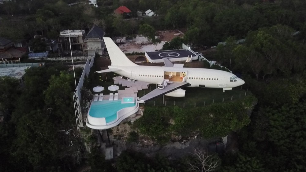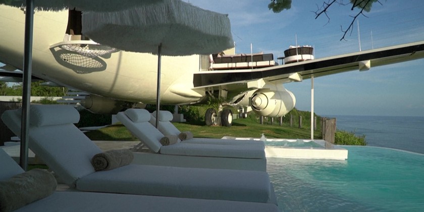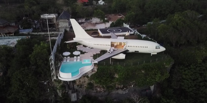 The Private Jet Villa, situated on a cliff overlooking Nyang-Nyang Beach in Badung town, makes use of an abandoned plane body, allowing guests to enjoy sleeping in the actual cockpit said "This is something special, an experience that you can feel and enjoy. Staying inside the plane, living super luxury on the edge of the cliff, 150 meters above the ocean. With fantastic view and we craft this experience for all small details so people can enjoy it and something what they might never hear, experience. It is something new."