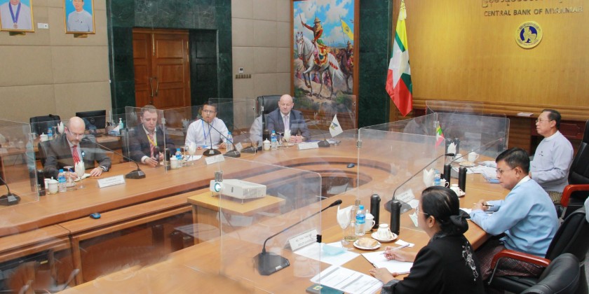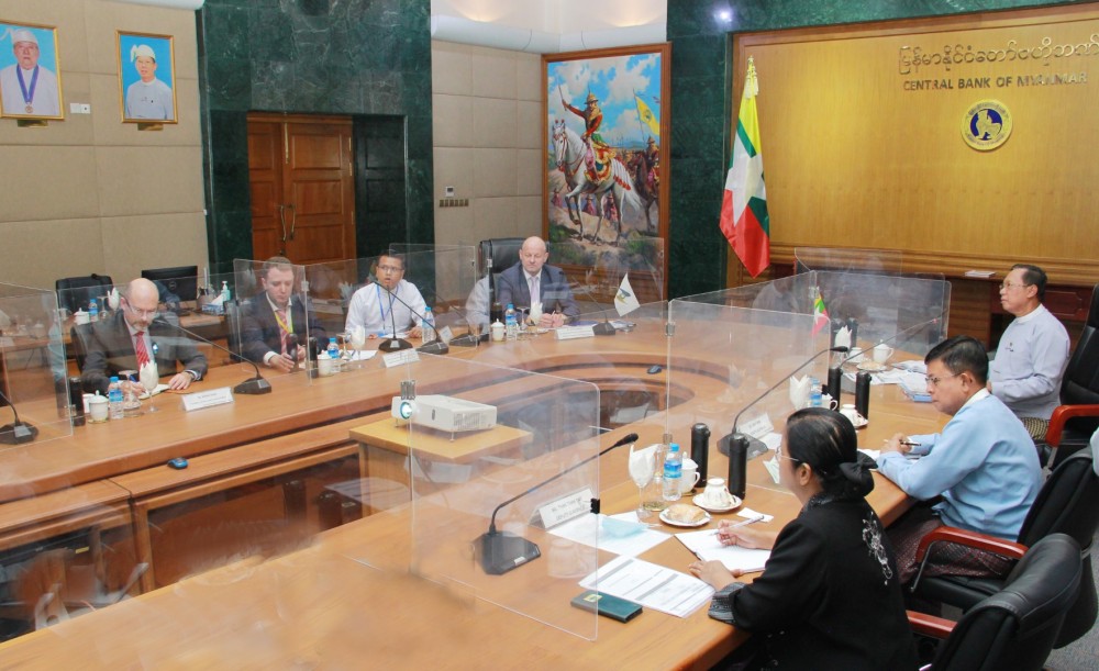 Governor of the Central Bank of Myanmar U Than Nyein and vice governors U Win Thaw and Daw Than Than Swe received the Eurasian Economic Commission at the Central Bank of Myanmar. The meeting focused on banking and financial cooperation between Myanmar and members of the Eurasian Economic Commission.