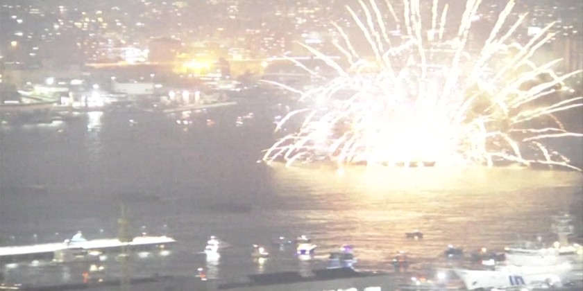 One of the vessels ablaze in the sea off Yokohama, south of Tokyo with pink and white sparks flying in all directions. Another one of the barges was carrying five workers, all of whom jumped into the sea to escape and were later rescued, the Yokohama coastguard bureau said. Fireworks are a fixture of Japan's summer, drawing crowds of festivalgoers.