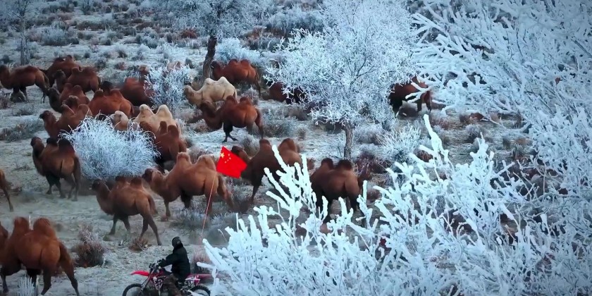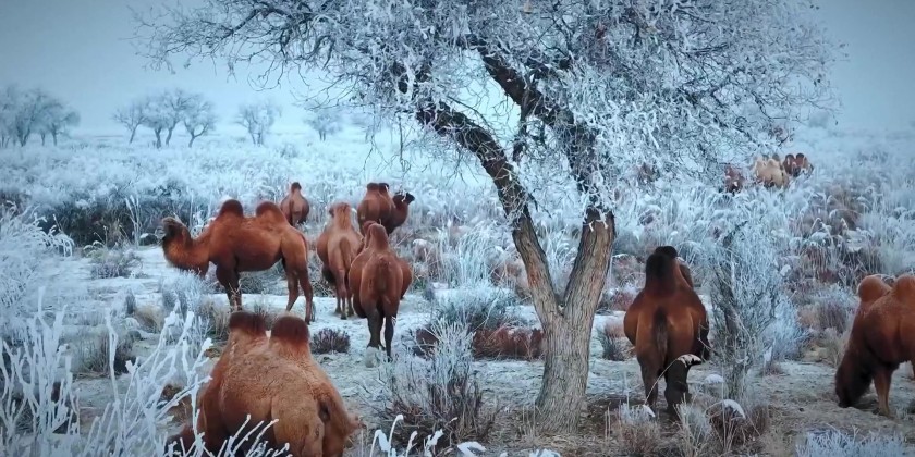 In Bohu County of Xinjiang, a desert has been blanketed in snow following recent widespread snowfall. Camels have been spotted wandering through this enchanting snow-covered landscape in search of food. The desert presented a picturesque snowy landscape where the crystal-clear frost has coated the branches of poplar trees in white.