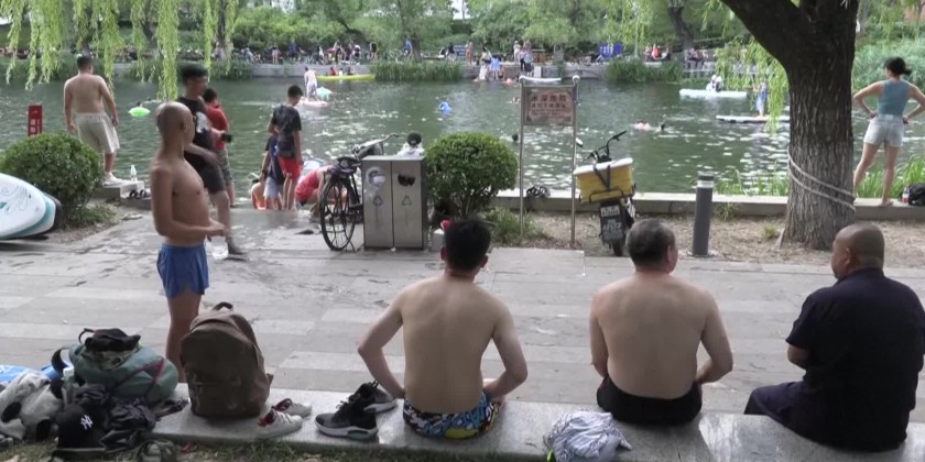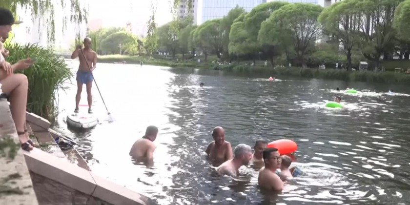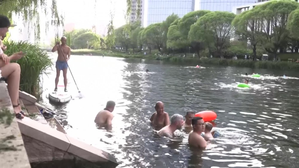 The figure is half a degree higher than the station's previous record of 40.6 C taken in June 1961. Along Beijing's canals, residents sought respite from the searing heat by swimming and splashing around in the water.