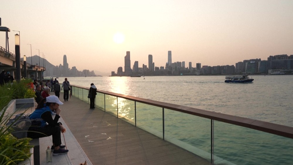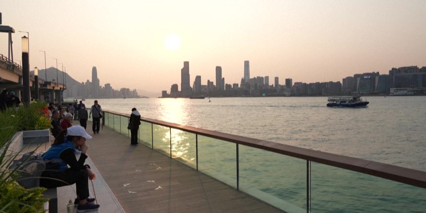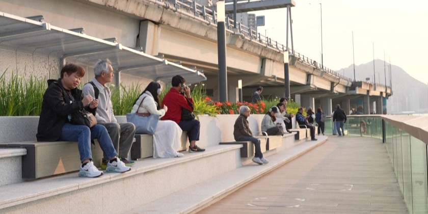 As traffic moves overhead, North Point residents gather on a new boardwalk to watch the sun set over Victoria Harbour. Built in the 1980s, the elevated highway once cut off access to the waterfront. This year, it was converted into a double-decker with a pedestrian level, reconnecting the community to the shoreline.