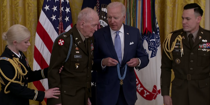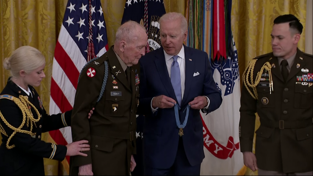 President Joe Biden awarded his first Medal of Honor Friday to a 94-year-old retired Army colonel for bravery under enemy fire more than a half-century ago in the Korean War. It took a policy change for retired Col. Ralph Puckett Jr. to receive the military's highest honor. The 2020 defense policy bill removed a requirement that such awards be given within five years of a valorous act.