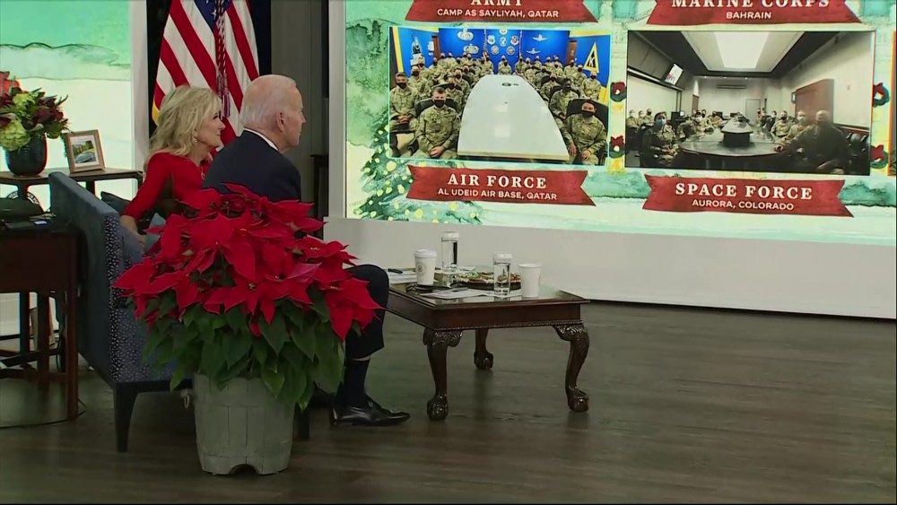 Speaking from the White House before a large screen showing representatives of the various armed forces, Biden thanked them for spending Christmas away from their families.
