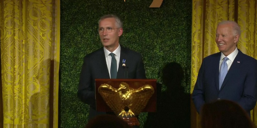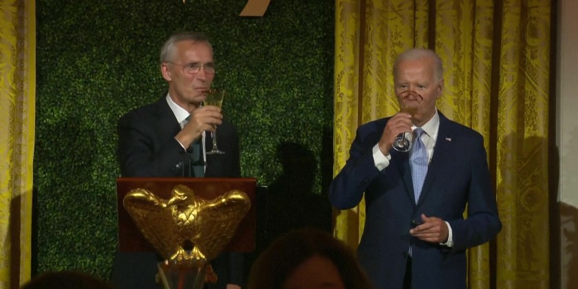 He toasted NATO and “our neighborhood of nations. May we continue to grow stronger and closer.” Biden appeared attentive as Jens Stoltenberg gave his remarks, laughing at times and sharing a toast at the end of his remarks.