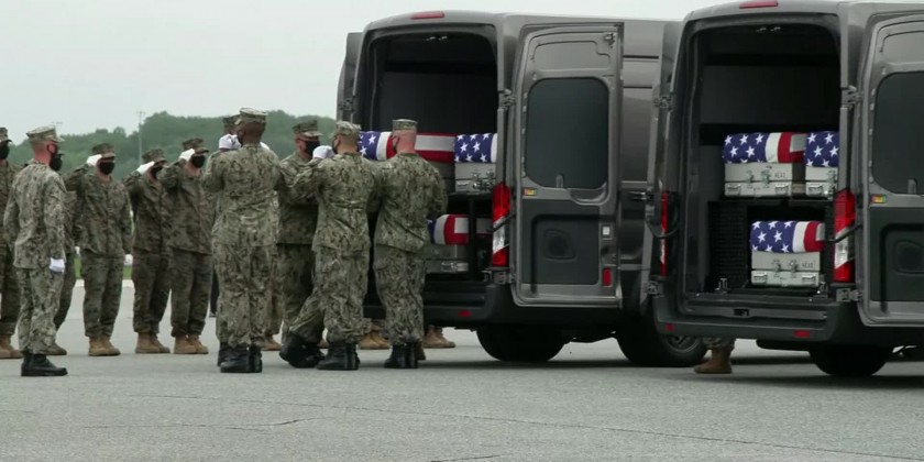 The president and first lady Jill Biden met in solemn privacy Sunday at Dover Air Force Base in Delaware with the families of the 13 U.S. troops killed in the suicide attack near the Kabul airport. Then the military ritual of a “dignified transfer” of remains unfolded for those killed in foreign combat. The dead ranged in age from 20 to 31, and came from California and Massachusetts and states in between.