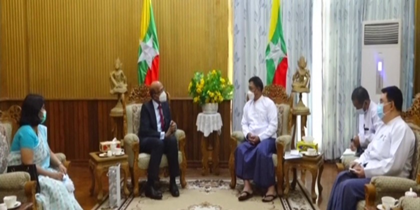The member of the State Administration Council Union Minister for Transport and Communications Admiral Tin Aung San received the India Ambassador to Myanmar Mr. Vinay Kumar at the ministry, Nay Pyi Taw on April 8.