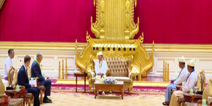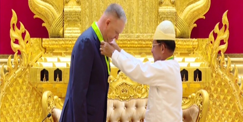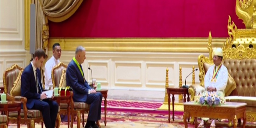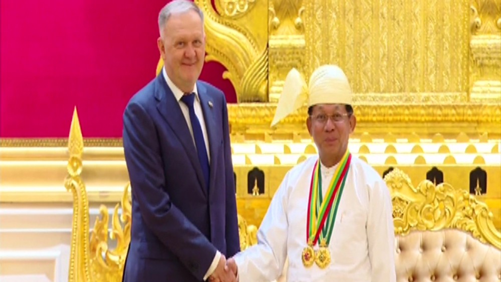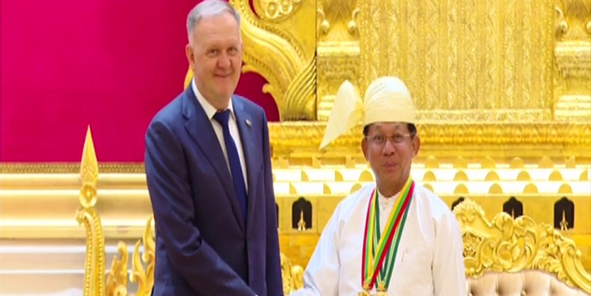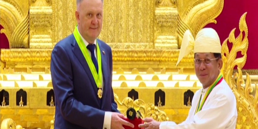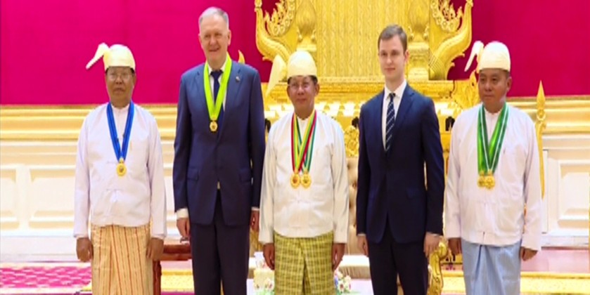 Chairman of the State Administration Council Prime Minister Senior General Thadoe Maha Thayay Sithu Thadoe Thiri Thudhamma Min Aung Hlaing attended a ceremony to confer Wunna Kyaw Htin title to Russian Ambassador to Myanmar Dr. Nikolay Listopadov in Nay Pyi Taw on Friday.