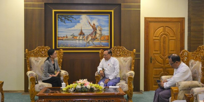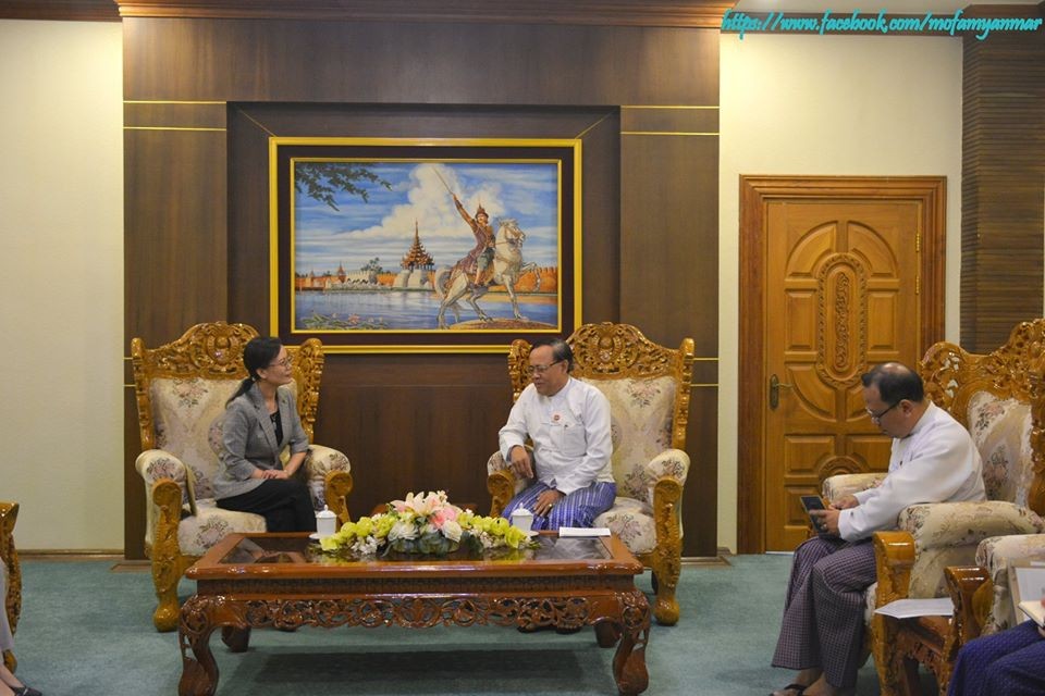 Union Minister for International Cooperation U Kyaw Tin received Charge' d' Affaires of the Chinese Embassy in Myanmar Mrs. Li Xiaoyan at the Ministry of Foreign Affairs in Nay Pyi Taw on Monday.