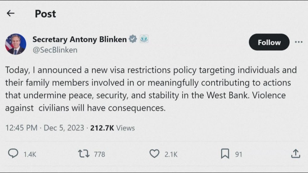 Blinken announces visa sanctions on extremist Israeli settlers over attacks