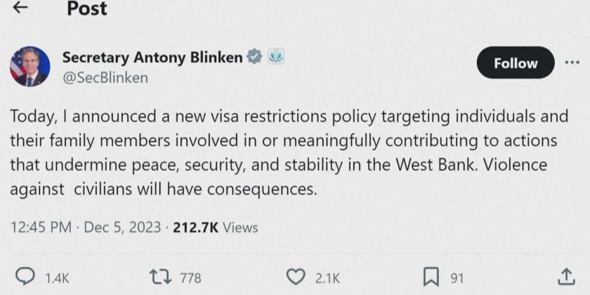 US Secretary of State Antony Blinken announced in a tweet that the United States would refuse entry to anyone involved in actions that undermine peace, security, and stability in the West Bank.