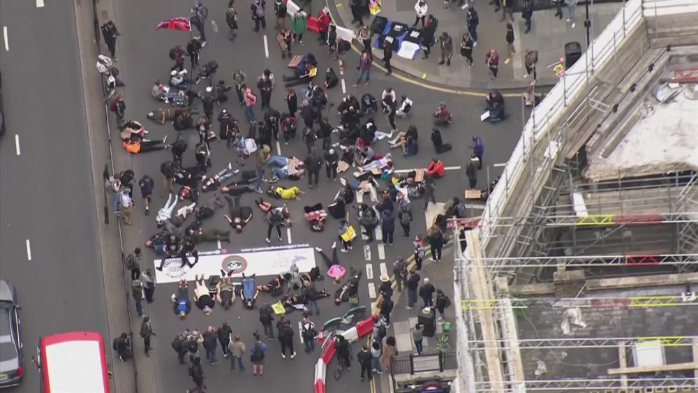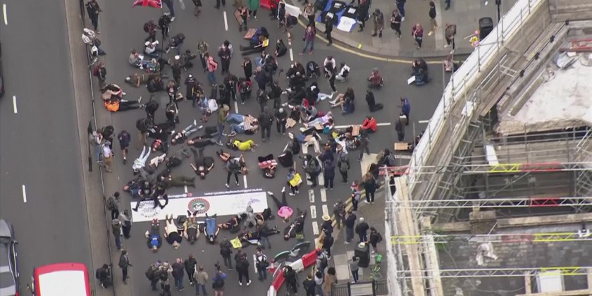 Dozens of protesters staged a 'die-in' protest in central London on Sunday, demonstrating against police brutality and anti-Black racism. Footage showed people laying down in the street and blocking traffic. Organiser Ken Hinds said the protest was to highlight racial injustice in the UK and denounced forthcoming government spending on prisons.