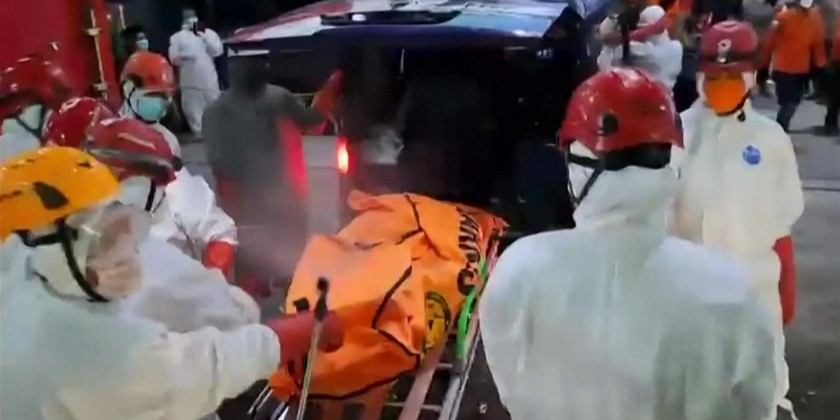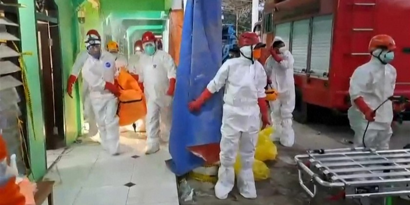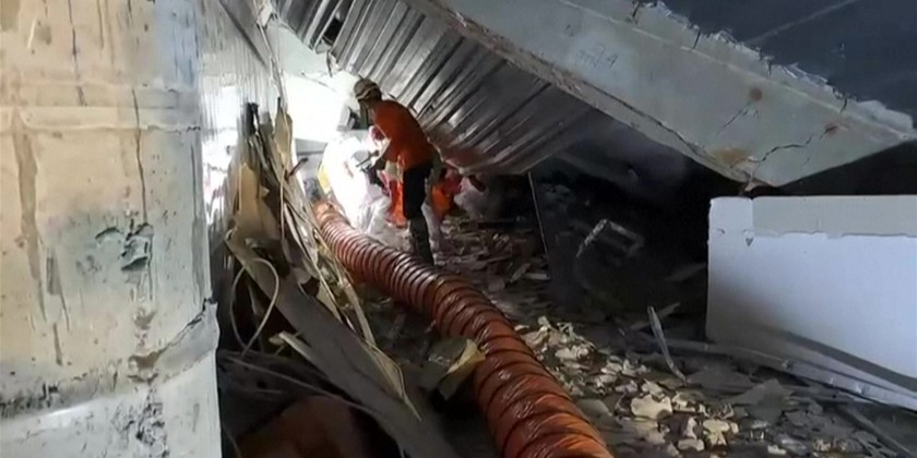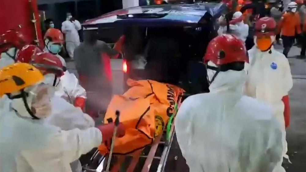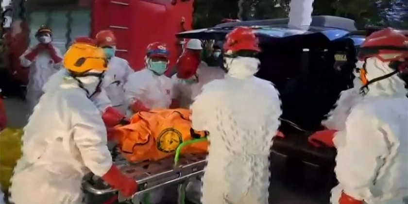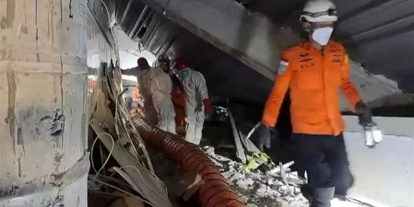Search and rescue workers carried bodies out of a school in Sidoarjo, on the Indonesian island of Java, four days after it collapsed. The death toll has risen to 10, but dozens are still believed to be trapped under the rubble with no signs of life.