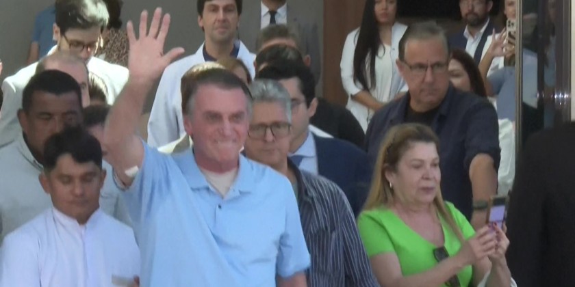Former Brazilian president Jair Bolsonaro is discharged from hospital in Brasilia, where he underwent abdominal surgery three weeks ago. Brazil's 70-year-old far-right leader, underwent surgery on April 13 to fix an intestinal obstruction, a complication stemming from a stabbing attack he suffered during a 2018 campaign rally.