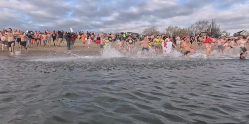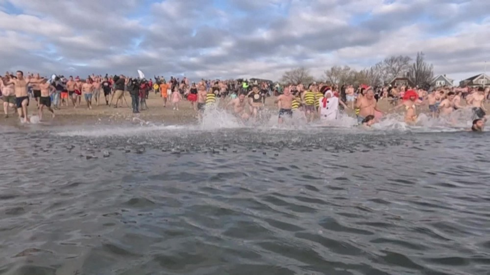 Dozens of participants in the annual L Street Brownies Polar Plunge run into the frigid waters of the Atlantic Ocean in the Northeastern US city of Boston to start off the new year.