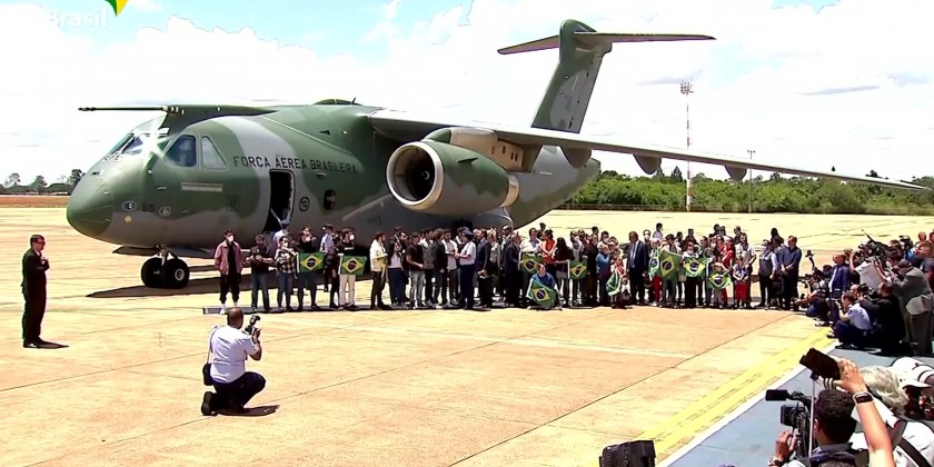 Brazilian President Jair Bolsonaro was among a welcome party for 42 Brazilians, 20 Ukrainians, five Argentinians and one Colombian arriving in Brasilia on Thursday after fleeing from conflict.