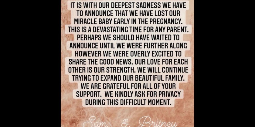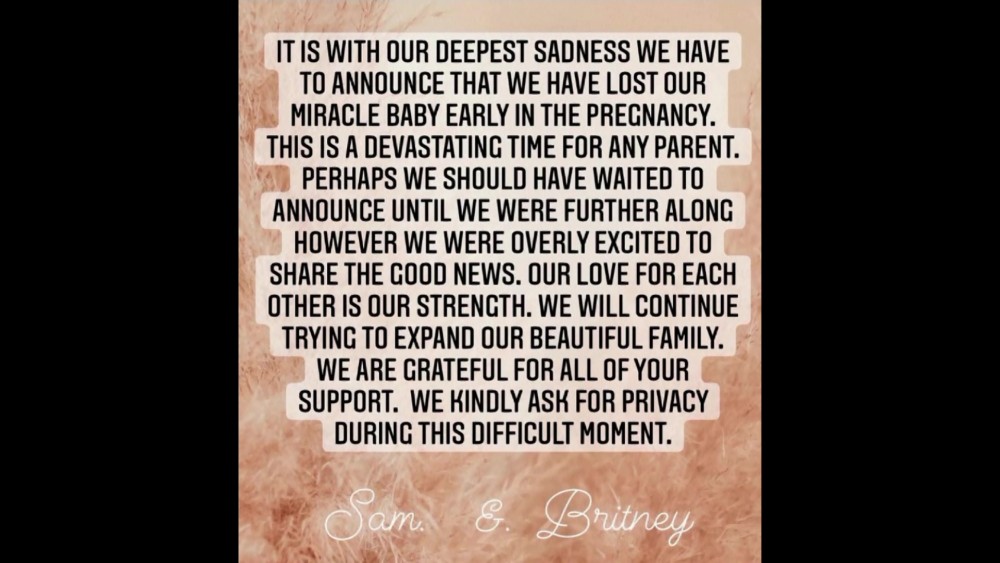 Britney Spears on Saturday announced that she had lost a baby early in her pregnancy. She confirmed the loss in a joint Instagram post with her partner, Sam Asghari.