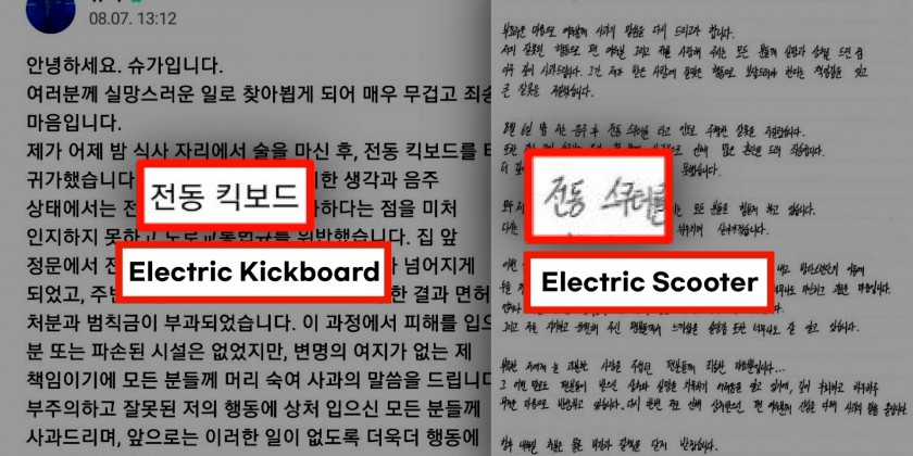 Regarding allegations of driving an electric scooter under influence, BTS Suga has posted a hand-written apology again in his fan community, saying that he was sorry for causing confusion with his initial apology. This is his second apology following the one uploaded immediately after the incident.