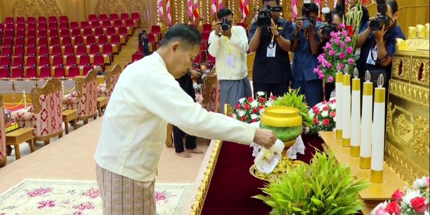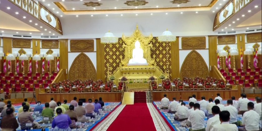 First, the Vice Senior General offered alms-food, fruits, flowers, water and candle light to the Buddha Image in the Aggadhipati Sasana Beikman. Then, the congregation led by the Vice Senior General observed the nine precepts administered by the Chairman of State Sangha Maha Nayaka Committee, Presiding Sayadaw of Thanlyin Min Kyaung Pahtamapyan Sarthintaik, and took the Metta Paritta Sutta recited by members of the Sangha.