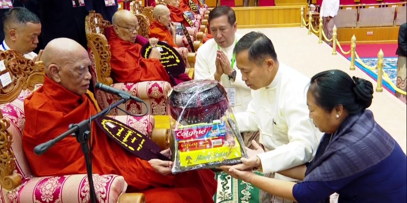 Next, the Vice Senior General, wife and officials donated the offertories to the Sayadaws and members of the Sangha. After that, the congregation listened to the sermon delivered by the Secretary of the State Sangha Maha Nayaka Committee, Presiding Sayadaw of MasoeyeinTaikthit, and shared the merits gained.