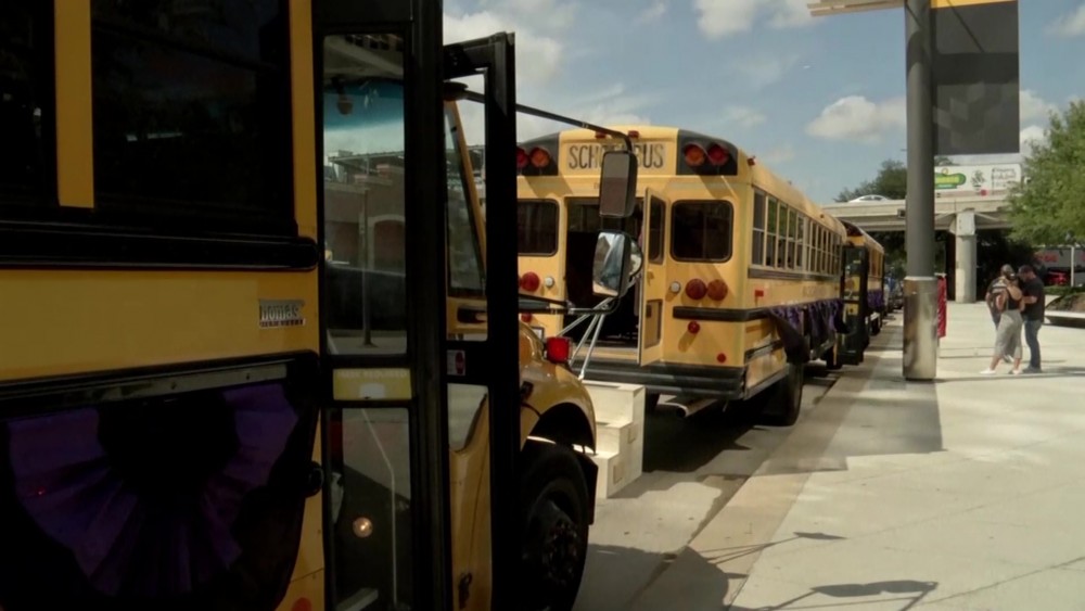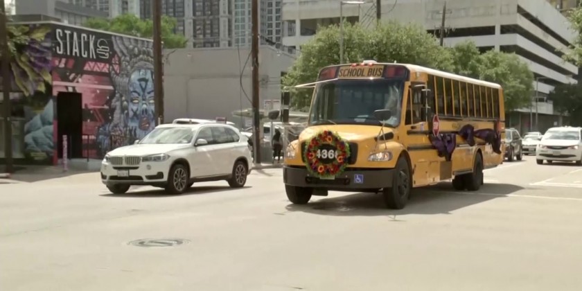 A mile long convoy of 52 school buses filled with personal memories of children killed in shootings visited Senator Ted Cruz's home and office today in Houston in US.Change the Ref is the organization leading the convoy.