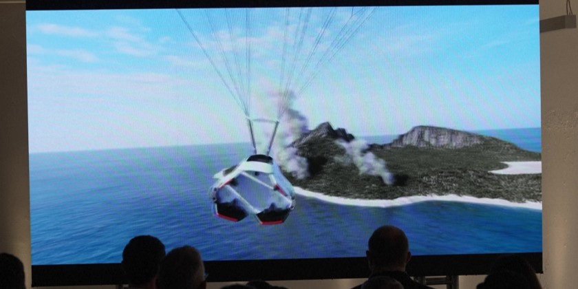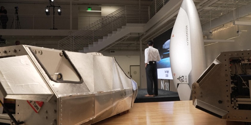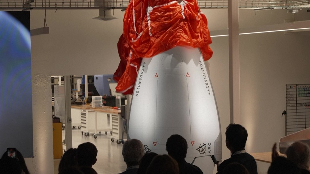 A model of the Inversion Arc autonomous space-based delivery vehicle to deliver cargo anywhere on Earth is unveiled at the Inversion headquarters in Los Angeles. Inversion’s Arc spacecraft is being designed to deliver cargo from low-Earth orbit with hypersonic reentry to any location on Earth in one hour for commercial, government, and defense applications with a first launch planned for 2026.