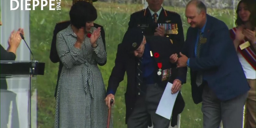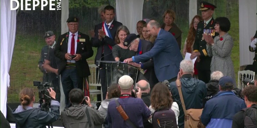 During the ceremony, Taylor thanked 100-year-old Canadian veteran Gordon Fennell, who took part in the Dieppe Raid, for his services during the war. During the course of this operation, many Canadian soldiers were wounded, 916 were killed, and 1,946 were taken as prisoners of war.