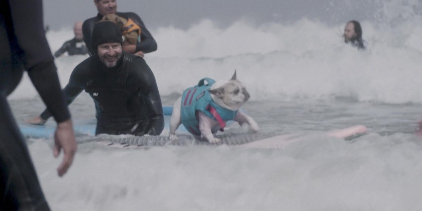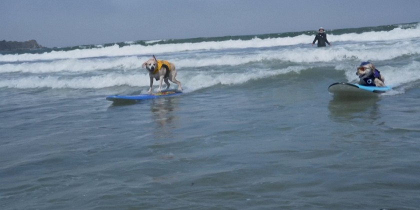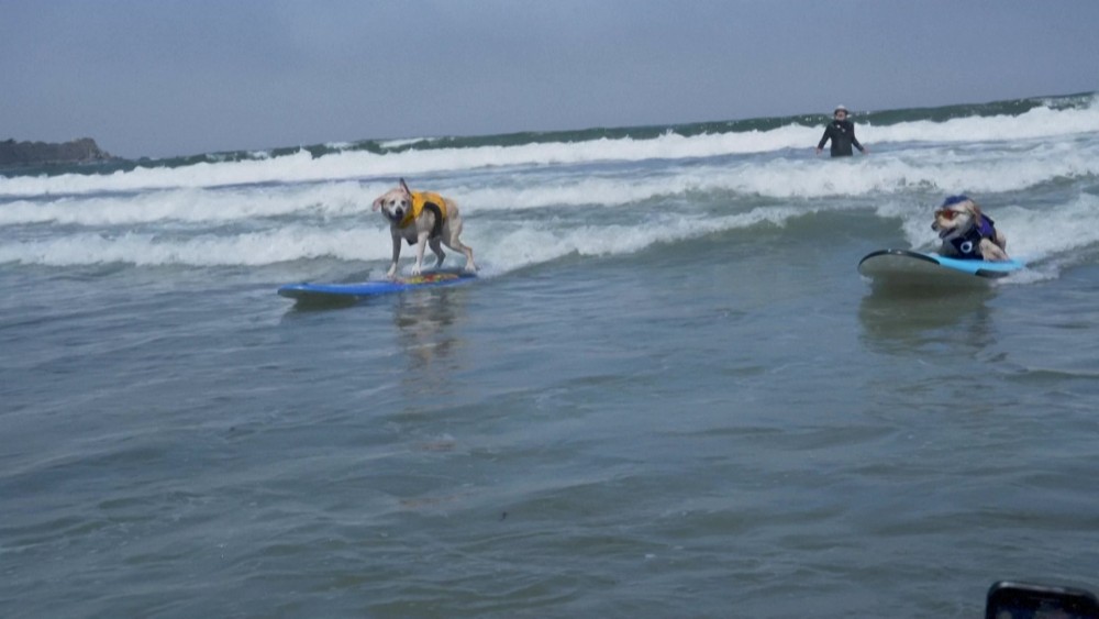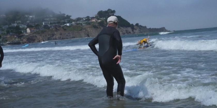 Dogs in wetsuits ride waves as the World Dog Surfing Championships kicks off in Pacifica, California. The dogs, trained to surf, ride the waves as part of the competition.