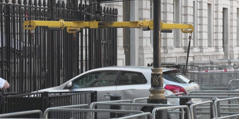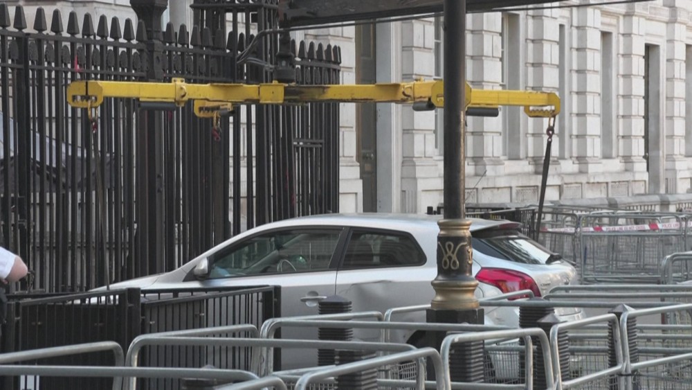 Armed officers arrested the man at the scene on suspicion of criminal damage and dangerous driving, shortly after the vehicle "collided with the gates of Downing Street" at around 16:20 pm, London police said.