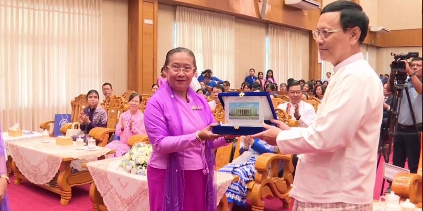 Afterward, Acting Rector Dr. Nu Nu Lwin presented the Union Minister and Deputy Ministers with a commemorative gift. The Union Minister, Deputy Ministers, and Acting Rector then presented certificates of appreciation to the companies and organizations that participated in the event before taking a group photo. They also toured the various booths at the career fair.