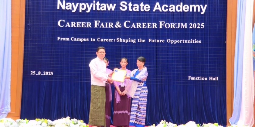 The second part of the event began in the afternoon. U Tun Tun Naing, the Chairman and Group CEO of Blue Ocean Investment Co., Ltd., gave a talk on "Shaping the Future Opportunities." This was followed by a panel discussion on "From Campus to Career." Acting Rector Dr. Nu Nu Lwin then presented certificates of appreciation to the speakers and panelists of the forum.