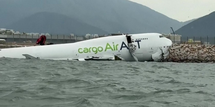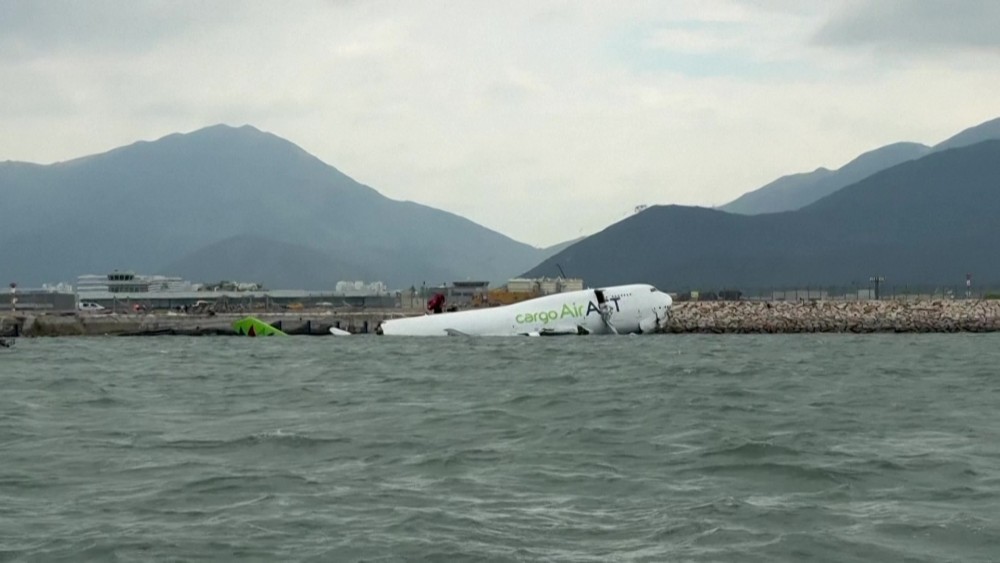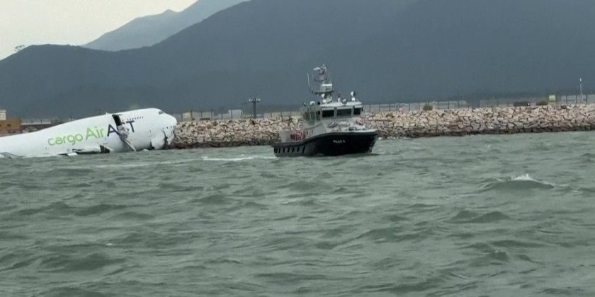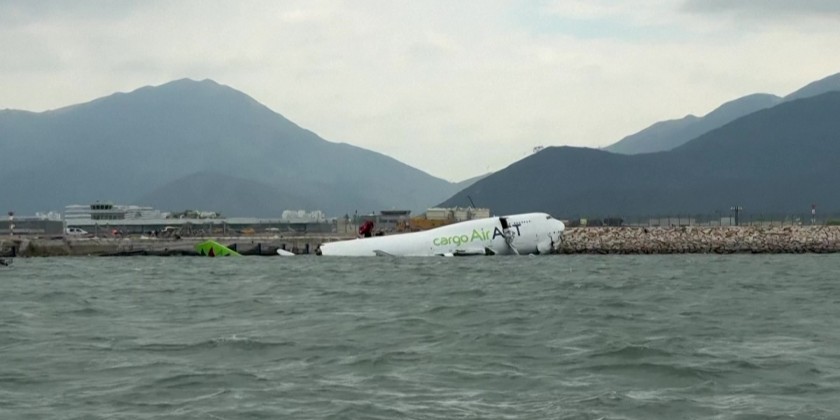Officials said an investigation would aim to determine what caused the Boeing aircraft to leave the tarmac at Hong Kong International Airport, one of the busiest in the world for air cargo. The plane's damaged fuselage was left partly submerged in the sea water that borders the airport, with its emergency evacuation slide extended following one of the most serious incidents since the hub began operations in 1998.