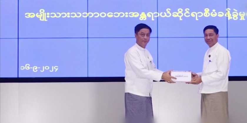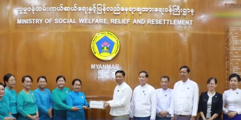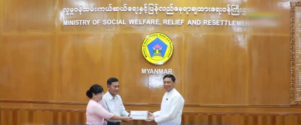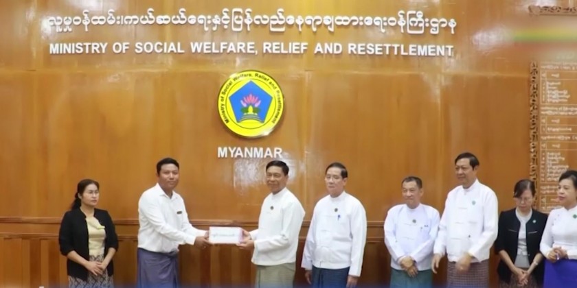 During the ceremony, Union Minister Dr. Soe Win received a cash donation of over 176 million kyats, basic foodstuff and drinking water bottles from well-wishers and presented certificates of honor in return.