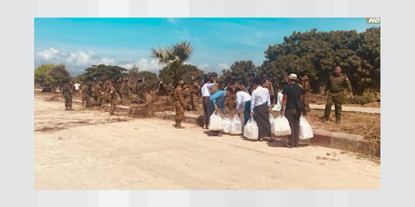 Union Minister for the Ministry-1 at the Office of Chairman of the State Administration Council Admiral Moe Aung and his family donated breakfast and lunch boxes, instant noodle packs, and soft drinks to military personnel, Myanmar Police Force and Fire Brigade members working on rehabilitation along PinLaung and Pobbathiri Roads, through the Ministry of Social Welfare, Relief and Resettlement.
