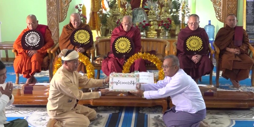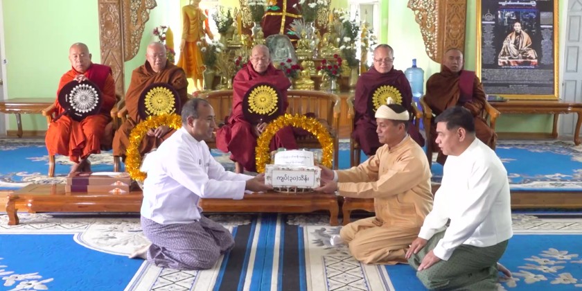 Following this, the Chief Minister U Aung Aung, the Commander of East Command Major General Zaw Min Latt, and state ministers offered the requisites and cash donations to the members of Sangha. The cash donation ceremony for Shwe Bhone Pwint Pagoda proceeded, the Chief Minister, state ministers, the State Advocate General, the heads of state-level departments, representatives from self-administered division, self-administered zones, district and township administrative bodies, state government sub-divisions, individual donors, and corporate donors donated cash donations. The donations were received by the responsible members of the Shwe Bon Pwint Pagoda’s board of trustee, in turn, presented certificates of honor to the donors.